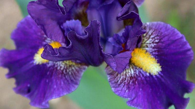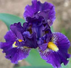 Ирис бородатый карликовый Tourist Trap (Туэрист Трэп). Стандарты чернильно-синие. Фолы цвета стандартов, на плечиках пликата. Бородка с переходом от оранжевому к светло-желтому. Срок цветения средне-ранний. Высота 39 см.