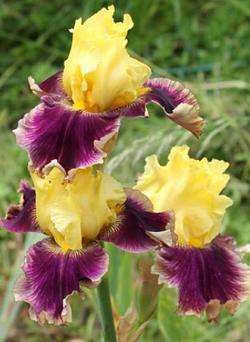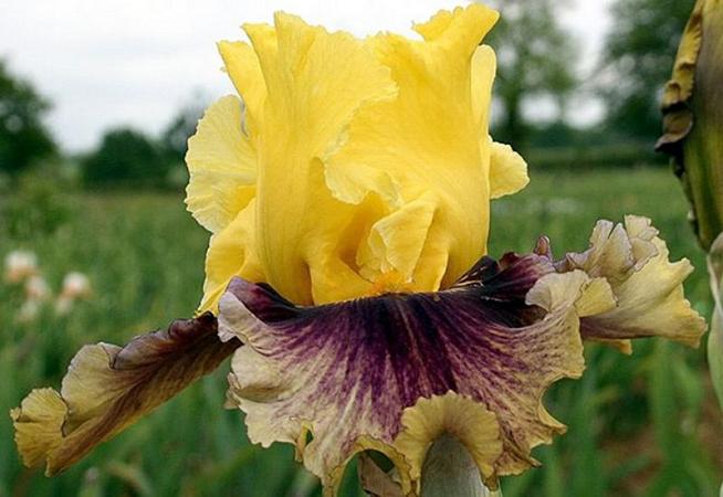 Ирис Treasure Trader (Треже Трейдер). Стандарты лимонно-желтые, фолы цвета бургунди, на плечиках почти черные, кромка лимонно-бежевая. Бородка горчичная. Контрастный, очень красиво гофрирован. Высота 94 см.