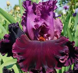 Ирис высокий бородатый Up In Flames (Ап Ин Флеймз). Стандарты пурпурно-розовые. Фолы бархатные, темно-гранатовые с темными жилками и каймой цвета стандартов. Бородка красно-оранжевая. Высота 94 см. Имеет награды.