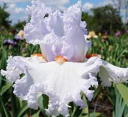 Ирис высокий бородатый Vanilla Frappe (Ванилла Фраппе). Стандарты нежно-лавандовые, зубчатые, пенные. Фолы чуть светлее. Цветок с эффектом сверкающей пудры. Бородка мандариновая с небольшими лавандовыми рожками. Очень крупные, кружевной, нежный! Срок цветения средне-поздний, высота 89 см.