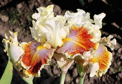 У бородатых ирисов толстое многолетнее корневище располагается горизонтально вровень с почвой, от него отходят длинные шнуровидные корни, образующие мочковатую корневую систему. Мечевидные листья, покрытые сизым восковым налетом, сложены веером. Вырастив такого метрового красавца вблизи дома или дорожки, вы подарите себе ни с чем несравнимое удовольствие наблюдать за рождением цветка, изменением его очертаний и оттенков по мере взросления.