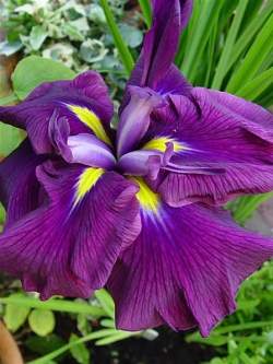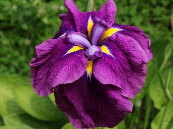 Внешний вид: высота растения 80 см, листья мечевидные, к концу суженные, светло-зеленые, у основания красно-фиолетовые, с ярко-выраженной средней жилкой. Цветки крупные фиолетовых оттенков с сине-желтым центром