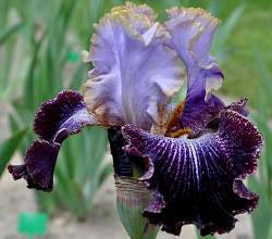Ирис высокий бородатый Wladca Mgiel (Владка Мгиель). Стандарты лавандовые с пепельным оттенком, по краю тонкая коричневатая кайма. Фолы пурпурные с белыми прожилками от бородки. Бородка горчичная. Окраска необычная и эффектная. Красивая гофрировка. Срок цветения средний. Высота 79 см.