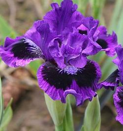 Ирис бородатый карликовый Yodel (Йодль). Стандарты пурпурные, фолы такие же с большим черным пятном в центре. Около бородки белая штриховка. Бородка оранжевая с пурпурным. Шокирует яркостью и выразительностью. Высота 25 см. Срок цветения поздний.