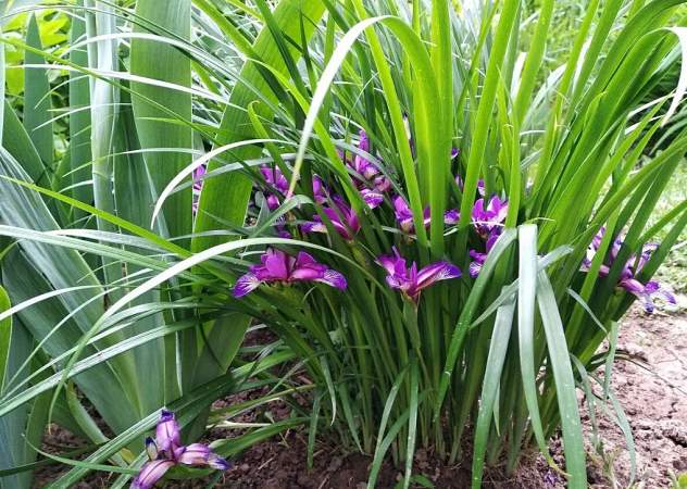 Ирис злаковидный. Неприхотливый многолетник, сохраняющий декоративность в течение всего сезона, до заморозков. Листья изящные, узкие, блестящие. Цветки до 8 см в диаметре, сочетают голубой, фиолетовый и лиловый цвета, расположены в гуще листвы, но хорошо видны. Цветет в июне.