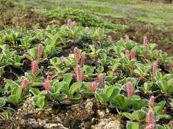 Ива ползучая. Имеет стелющиеся побеги, длиной до 2 м. Листочки слегка округлые, серёжки светло-роовые, длиной до 4 см, прямостоячие.