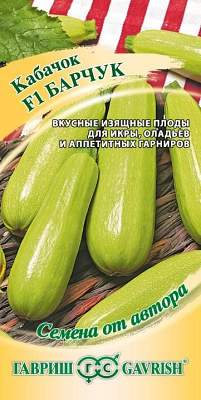Кабачок Барчук F1. Ранний продуктивный гибрид. Растения полуплетистые. Плоды изящной формы, цилиндрические, тонкие, длиной 18-20 см, массой 0,6-0,9 кг. Мякоть очень вкусная, нежная, белая. Гибрид устойчив к основным заболеваниям кабачка. Рекомендуется для