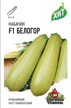 Кабачок Белогор F1. Раннеспелый (40-50 дней от всходов до начала созревания) гибрид. Куст компактный, преобладают одностебельные растения, главный побег короткий. Плод цилиндрический, массой 0,5-1 кг. Поверхность гладкая, зеленовато-белая, без сетки и рисунка. Кора тонкая. Мякоть белая, плотная, нежная. Вкусовые качества отличные. Урожайность 12-14 кг/м2. Хорошо отзывается на внесение органических удобрений. Выращивается рассадным способом и прямым посевом в грунт.