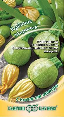 Кабачок Морячок 2 г авторский Н15. Раннеспелый (35-40 дней от всходов до технической спелости) кустовой сорт с оригинальными округлыми плодами. Плоды слаборебристые, светло-зеленые, беловатые, со светлой диффузной пятнистостью и крапчатостью, массой 0,5-0,6 кг (молодые плоды), до 2-3 кг (зрелые). Мякоть белая, отличного вкуса.