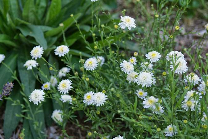 Калимерис перисто-рассеченный Hortensis (Хортенсис). Неприхотливый многолетник, цветущий со второй половины лета до заморозков. Образует воздушный округлый куст, усыпанный маленькими махровыми "ромашечками". Предпочитает бедные песчаные почвы, открытое солнце.