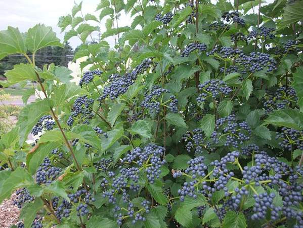 Калина Blue Muffin (Блю Маффин). Зубчатая калина используется в качестве декоративного садового растения. Летом кустарник покрывается ароматными белыми цветами, а к осени на их месте вызревают синие ягоды. Лучше всего сорт растет на освещенных участках, но может переносить и легкую полутень, а также небольшой ветер. В первые несколько лет молодое растение может подмерзать, поэтому нуждается в укрытии в холодные месяцы.