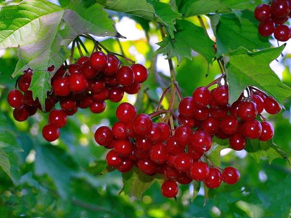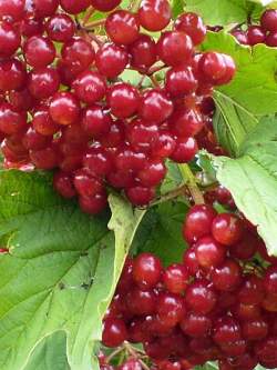 Калина Гранатовый браслет. Куст среднерослый, крона шаровидная. Побеги прямые, зеленого оттенка, морозостойкие, листья среднего размера, зеленые, соцветия многоцветковые. Плоды средним весом в 0,6-1,8 грамм, имеют округло-овальную форму, немного вытянутую к вершине. Вкус характерный калине: кисловато-сладкий с легкой горечью. Урожайность и устойчивость к болезням высокая, грибково-вирусные инфекции сорту не страшны.