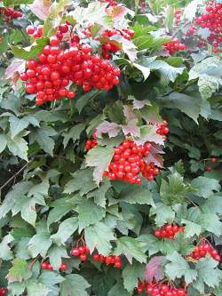 Калина Красный коралл. Куст компактный, средней высоты. Мелкие листочки, трех- или пятилопастные, весной светло-зеленые, летом зеленые, осенью окрашиваются в красноватые тона. Цветки душистые, краевые цветки белые, стерильные, серединные мелкие, в начале белые, потом розовато-белые.