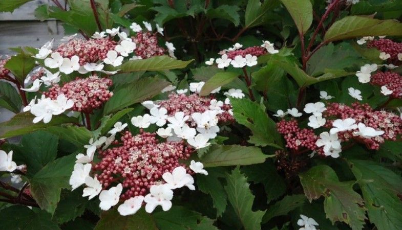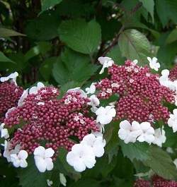 Калина Саржента Onondaga (Онондага). Шикарная калина, в цвету великолепна. Куст ветвистый, высотой 250-300 см. Характер роста побегов скорее вертикальный. Бутоны красные, стерильные цветки розовато-белые, окружают бутоны как венок. Красивая осенняя окраска листьев (алый, оранжевый). Ягоды красные. Очень легка в выращивании, прекрасно растет в подтопляемых местах, полностью зимостойка в средней полосе. Прекрасный медонос.