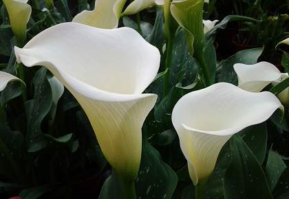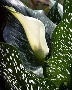 Калла альбомакулата. Покрывало белое, на листьях белые штрихи. Эта классическая калла станет звездой летнего сада, особенно если посадить рядом несколько клубней, чтобы получился большой куст.