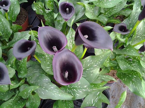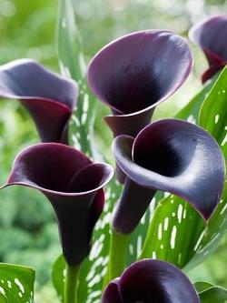 Калла Cantor (Кантор). Покрывало благородного бордово-черного цвета. Листья зеленые с белым крапом. Цветение длительное, с июля до начала осени. Высота не превышает 60 см. Используется для выращивания на садовых участках и в контейнерах. Долго стоит в срезке.