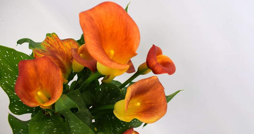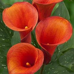 Калла Captain Fuego (Кэптин Фуэго). Бутоны по форме напоминают ровные свечи. Со временем распускаются шикарные крупные цветы оранжевого цвета. Продолжительность цветения каждого цветоноса 3-4 недели. Высота восхитительной садовой каллы достигает 50 см, с темно-зелеными будто восковыми листьями, на которых расположен редкий крупный крап белого цвета. Цветут каллы в июне-августе.