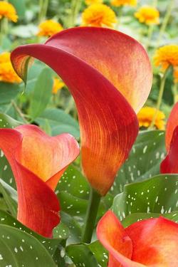 Калла Captain Safari (Кэптин Сафари). Бутоны по форме напоминают ровные свечи. Со временем распускаются шикарные крупные цветы красно-оранжевого цвета. Продолжительность цветения каждого цветоноса 3-4 недели. Высота восхитительной садовой каллы достигает 60 см, с темно-зелеными будто восковыми листьями, на которых расположен редкий крупный крап белого цвета. Цветут каллы в июне-августе.