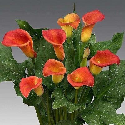 Калла Captain Trinity (Кэптин Тринити). Листья темно-зеленого цвета с редким белым крапом и восковым блеском. Отличается длительным периодом цветения. Цветение обильное. Из одного взрослого клубня выходит до 9 высоких цветоносов с эффектными цветкам.