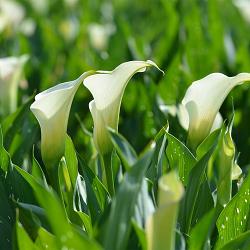 Калла Captain Ventura (Кэптин Вентура). Покрывала белоснежные, крупные, держатся до месяца. Высота около 60 см. Листья с восковым налетом, зеленые с белыми штрихами. Цветение в июне-августе.