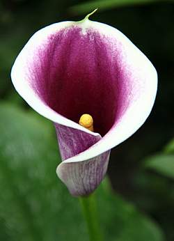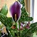 Калла Picasso (Пикассо). Покрывала белые, внутренняя часть аметистового цвета. Листья большие с крупными белыми штрихами, очень эффектные. Прекрасное растение как для сада, так и для дома.