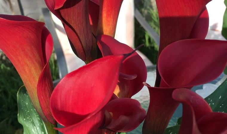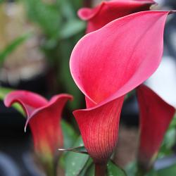 Калла Red Charm (Ред Чарм). Бутоны по форме напоминают ровные свечи. Со временем распускаются шикарные крупные цветы красного цвета. Продолжительность цветения каждого цветоноса 3-4 недели. Высота восхитительной садовой каллы достигает 45 см, с темно-зелеными будто восковыми листьями, на которых расположен редкий крупный крап белого цвета. Цветут каллы в июне-августе.