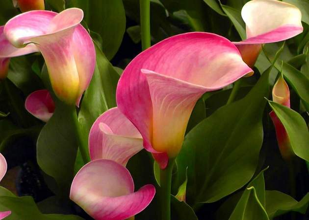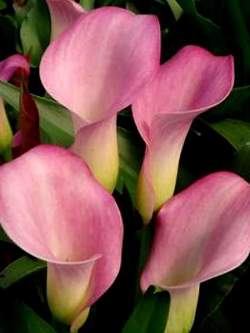 Калла Samur (Самур). Покрывало розовато-сиреневое, окрашено неравномерно, что очень красиво. Листья стреловидные, ровно-зеленые.