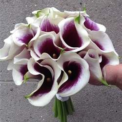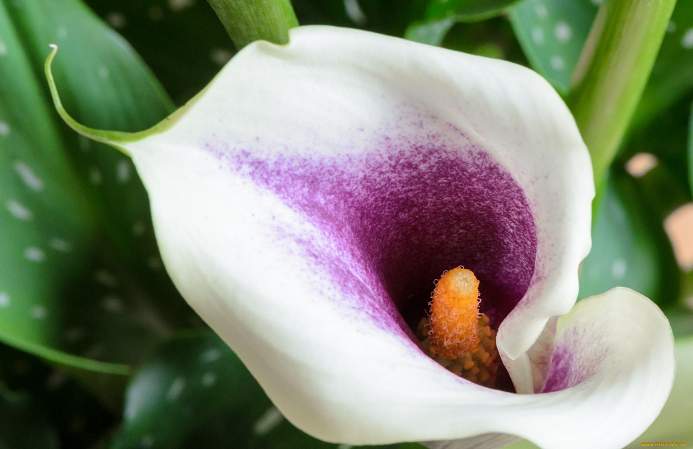 Калла Vermeer (Вермеер). Без преувеличения можно сказать, что это шедевр. Покрывало белое, пурпурное пятно из центра расходится по внутренней стороне покрывала широким мазком. На его фоне ярко выделяется оранжевый колос. Листья с белыми штрихами. Розетка крупная, широкая.