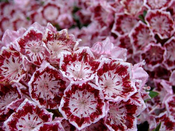 Кальмия Black Label (Блэк Лейбл). Куст с прямостоящими побегами. Молодые побеги красные, листья темно-зеленые, кожистые. Цветки крупные, около 3 см в диаметре, розовые, с четкой темной полосой внутри по краю короны. Соцветия имеют до 200 цветков. Цветение очень обильное. Сорт устойчив к болезням, особенно к пятнистости листьев. Морозостойкая.