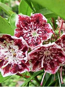 Кальмия Jans Delight (Дженс Делайт). Куст довольно высокий, широкий. В 10 лет достигает 100 см в высоту и 70 см в ширину. Бутоны розовые. Цветки в серединке белые, внутри чашечки широкое бордовое кольцо, которое по краям состоит из множества мелких бордовых крапинок. Диаметр цветка — 2,8 см. Морозоустойчивость до -26 °C. Кальмии являются прекрасным вечнозеленым дополнением для рододендронов.
