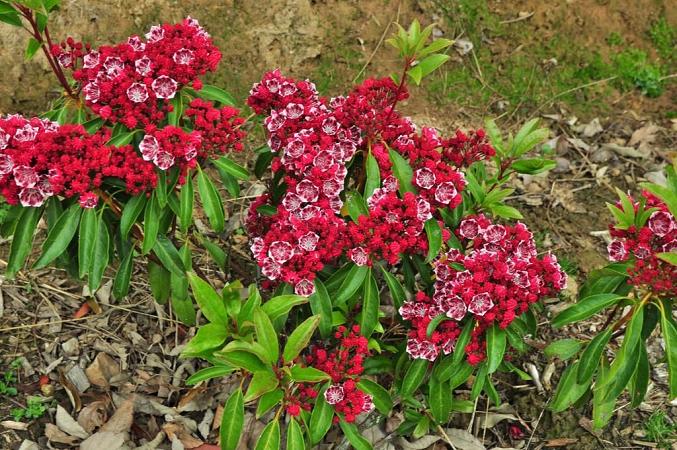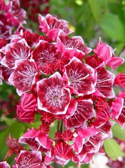Кальмия Kaleidoscope (Калейдоскоп). Высота куста может достигать 1,5-2 метров. Цветки светло-красные с белым центром и каймой, в соцветиях. Цветёт в июне, очень обильно и продолжительно. Для солнечных и полутенистых мест.