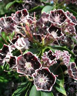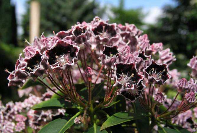 Кальмия Mitternacht (Миттернахт). Куст шаровидный, достигает 120 см после 10 лет. Бутоны нежно-розовые, почти белые. Цветы темно-шоколадные, край внутри короны светлее, почти белый. Самый темный из всех сортов кальмии. Цветет около 2 недель, позже чем другие сорта. Морозостойкая.