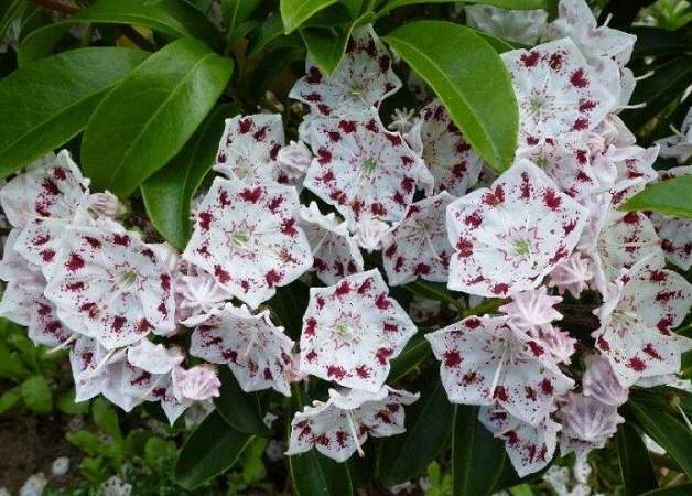 Кальмия Radiata (Радиата). Вечнозеленое растение. К десяти годам достигает 100 см в высоту. Листья темно-зеленые, довольно крупные, блестящие. Бутоны бледно-розовые, цветки белые с фиолетовыми пятнами. Предпочитают светлые, защищенные от ветра участки.