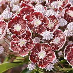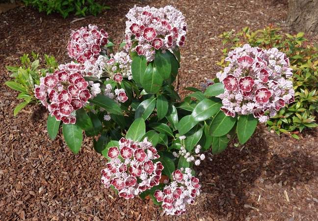 Кальмия Tad (Тад). Листья эллиптические, зеленые, слегка блестящие. Бутоны пурпурные. Цветки красновато-пурпурные с небольшим белым кольцом в центре и мелкими белыми точками у основания венчика. Диаметр цветка 3 см. До 140 цветков в соцветии. Цветет обильно.