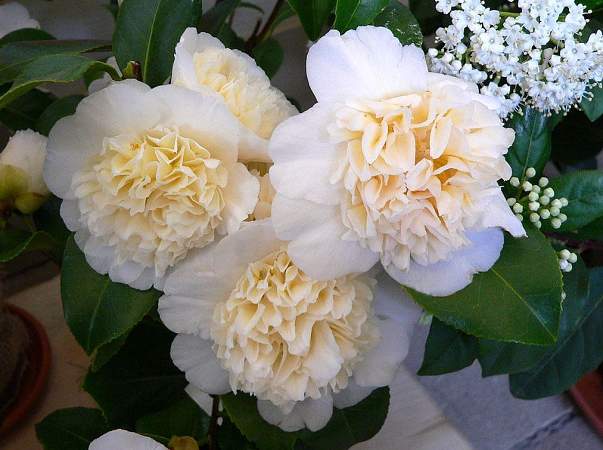 Камелия японская Brushfield's Yellow (Брашфилдз Йеллоу). Куст высотой до 150 см. Вечнозеленый кустарник с крупными махровыми цветками. Форма цветка анемоновидная. Крупные белые лепестки образуют чашечку, на которой, как сливочный крем, уложены рассеченные желто-кремовые лепесточки. Цветки крупные, 10 см в диаметре. Цветет камелия с февраля по апрель. Красивую глянцевую листву сохраняет весь год. Морозостойкость до -18 °С. Лето лучше содержать в саду или на балконе, но беречь от прямых солнечных лучей. Зимой содержат в закрытых помещениях при температуре не выше 20 °С (застекленный балкон, лоджия).