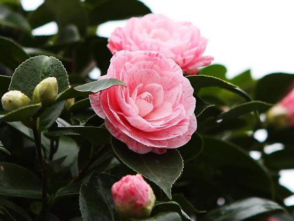 Камелия японская William Bartlett (Вильям Бартлетт). Куст высотой до 150 см. Вечнозеленый кустарник с крупными махровыми цветками. Цветки крупные, розовые с темно-розовым крапом, 10 см в диаметре. Цветет камелия с февраля по апрель. Красивую глянцевую листву сохраняет весь год. Морозостойкость до -18 °С. Лето лучше содержать в саду или на балконе, но беречь от прямых солнечных лучей. Зимой содержат в закрытых помещениях при температуре не выше 20 °С (застекленный балкон, лоджия).