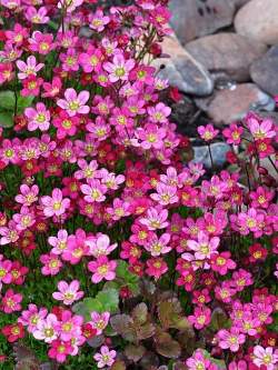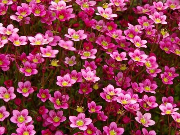 Камнеломка Арендса Carpet Purple Robe (Капет Пёпл Роуб). Образует густые ковры из мелких розеток. Цветоножки тонкие, на них расположены несколько колокольчатых, восходящих цветков различных оттенков — розовые, пурпурно-красные.