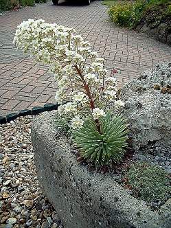Камнеломка Ice Queen (Айс Квин). Образует красивую плотную розетку из длинных узких листьев. Весной очень обильно цветет мелкими белыми цветочками, собранными в длинное свечевидное соцветие. Высота розетки 15-20 см, в цвету 40-50 см.