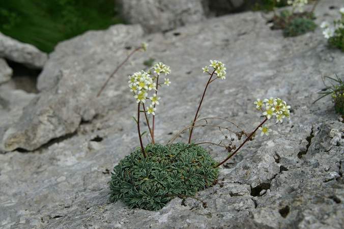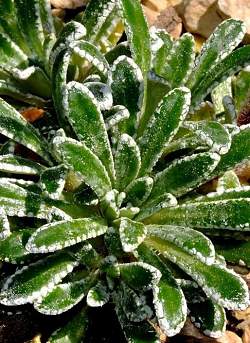 Камнеломка инкрустированная — вечнозеленое многолетнее почвопокровное растение. Белые цветки собраны в крупные метелки. Но привлекателен этот сорт своими листьями. Серебристо-серые листочки с мелкими зубчиками по краям собраны в розетки, которые формируют компактную подушку.