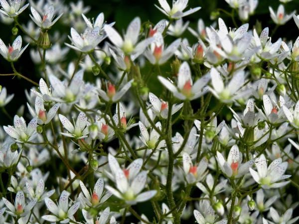 Камнеломка круглолистная. Неприхотливое и зимостойкое многолетнее растение высотой до 30 см (в цвету). Хороша весь сезон. Листики округлые, блестящие. Цветки мелкие, белые с малиновыми веснушками, многочисленные. Цветет в июне.