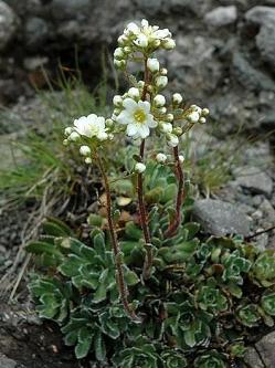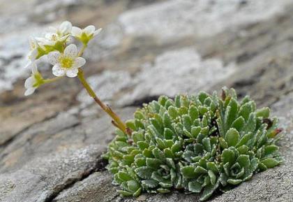 Камнеломка метельчатая. Листья с сизым оттенком, внешне похожа на молодило. Цветки мелкие, собраны в метельчатые соцветия на длинных цветоносах. Цветение обильное.