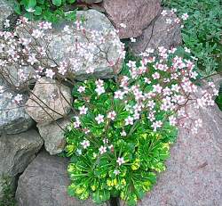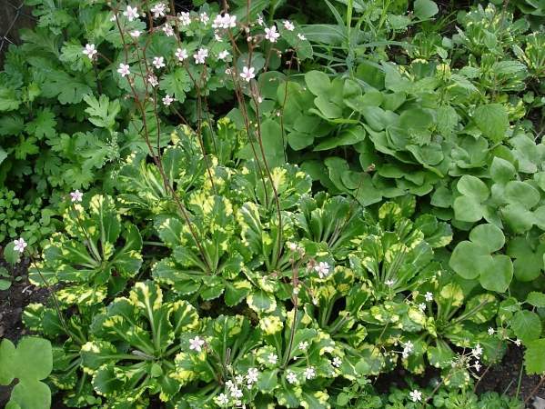 Камнеломка теневая Variegata (Вариегата). Представляет собой вечнозеленое многолетнее травянистое растение высотой до 10 см (в цвету до 25 см), образующее в процессе роста многочисленные компактные розетки. Напоминает пестрый коврик, цветущий нежно-розовыми цветками, собранными в воздушные соцветия.