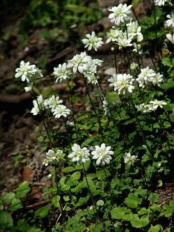 Рано весной из центра клубенька отрастают базальные листочки, их форма имеет вид полуокружности, по краю с округлыми зубцами. В середине мая из центра розетки поднимается цветонос высотой до 20-25 см, на его конце — 1-3 крупных, диаметром более 3 см, белоснежных, с зелёным в центре, махровых цветка. Листья почковидные, зубчатые по краю, в прикорневой розетке. В пазухах листьев и в основании розетки расположены мелкие клубеньки.