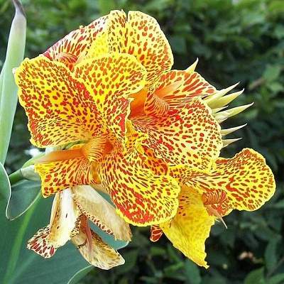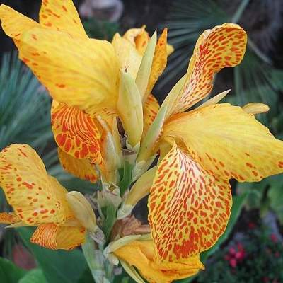 Канна En Avant (Эн Эвант). Крупное декоративное растения с крепким стеблем и вытянутыми красивыми листьями, покоряет обилием неповторимых соцветий желтого цвета с красноватым крапом.