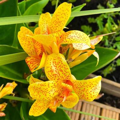 Канна Happy Emily (Хэппи Эмили). Сортосерия "Happy". Низкорослый компактный сорт высотой 50 см, пригоден для выращивания в горшках. Цветки большие, жёлтые с тёмно-оранжевыми пятнами. Листья зелёные. Цветение в июле-сентябре.