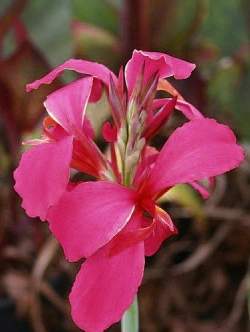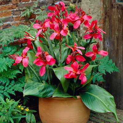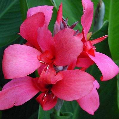 Канна Perkeo (Перкео). Крупные яркие цветы имеют насыщенный розовый цвет. Растение невысокое, в высоту составляет от 40 до 50 см. Стебли толстые, листья овальной формы. Диаметр бутона составляет 12 см. Высаживаются на расстоянии 50 см друг от друга.