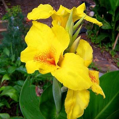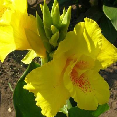 Канна Richard Wallace (Ричард Уоллес). Цветки крупные, лимонно-желтого цвета. В основании лепестков выразительный красный крап.