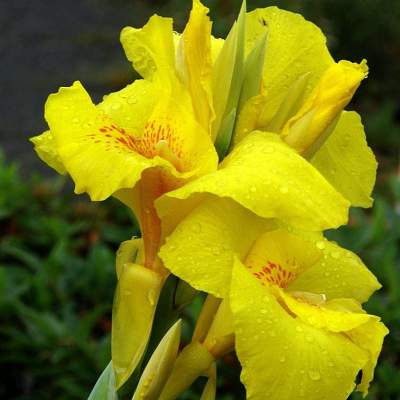 Канна Richard Wallace (Ричард Уоллес). Цветки крупные, лимонно-желтого цвета. В основании лепестков выразительный красный крап.