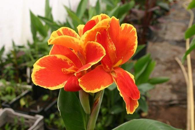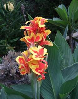 Канна Rosemond Coles (Роземунд Коль). Цветки пестрые, красно-желтые Прямые стебли не ветвятся. Высота около 90 см. Для благополучного выращивания нужны солнечные, защищенные от ветра площадки.