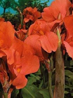 Канна Triomphe (Триумф). Многолетние, травянистое растение с клубневидными корневищами. Стебли прямостоячие, неветвящиеся. Высота растения 90см, цветки темно-лососевые. Предпочитают солнечные места, защищенные от холодных ветров.